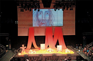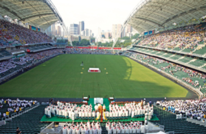 禮儀的安排,有頗大的改變,特別是將讀經台、祭台、主禮台的分立,又在球場大鐘位置,裝飾巨型壁畫,把禮儀的重點,表達更突出。