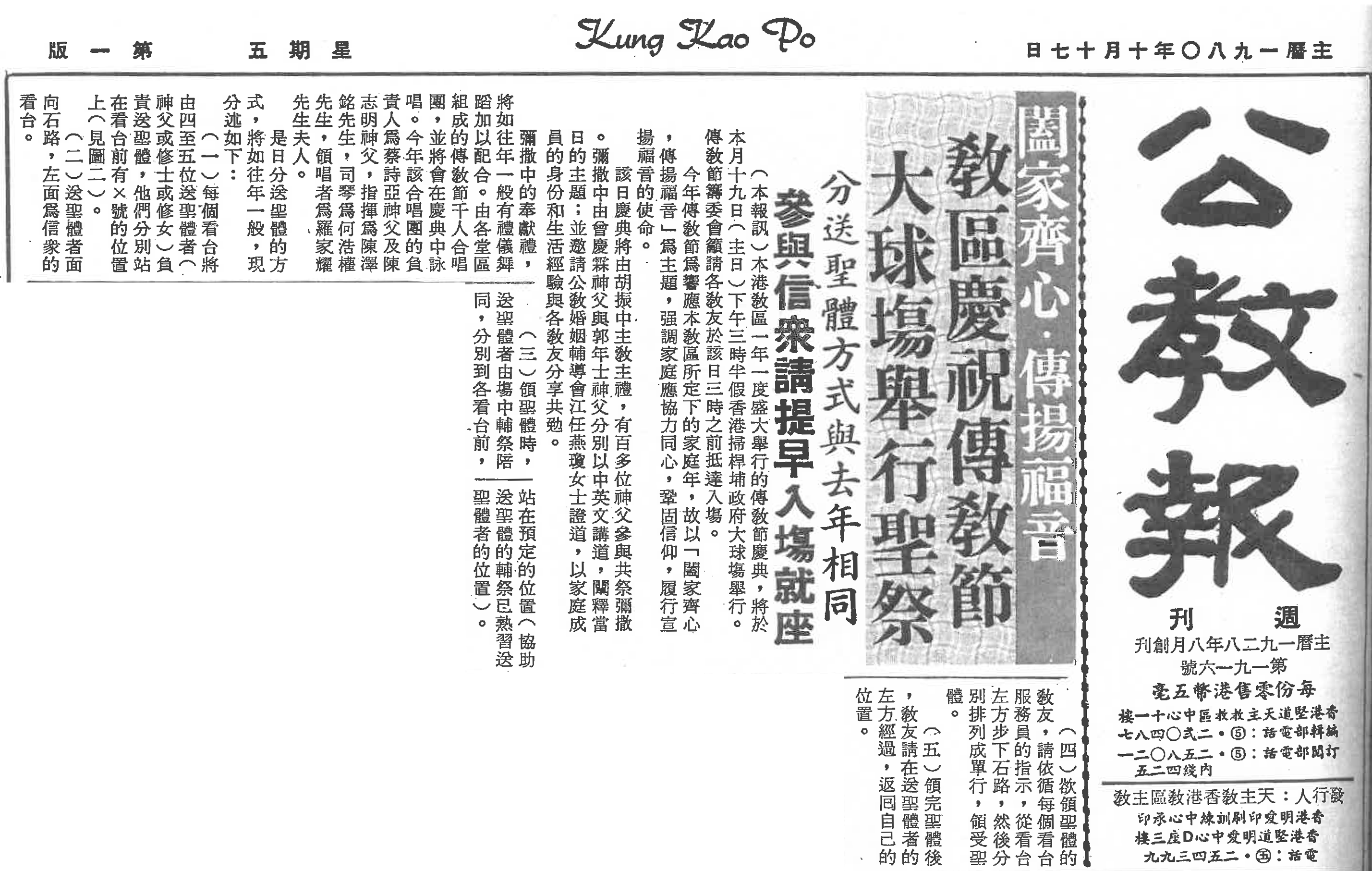 天主教教區一年一度公開的傳教節慶典於10月17日天主教教區一年一度公開的傳教節慶典書本月17日下午四時正假座香港政府大球場舉行。傳教節主題為「慕道」,是為配合本教區81至83年度的牧民方針以而選定,並以聖經中「你們要去使萬民成為門徒」(瑪28: 19)作為金句,勉勵信友遵從基督訓導,直接參與宣揚福音工作。