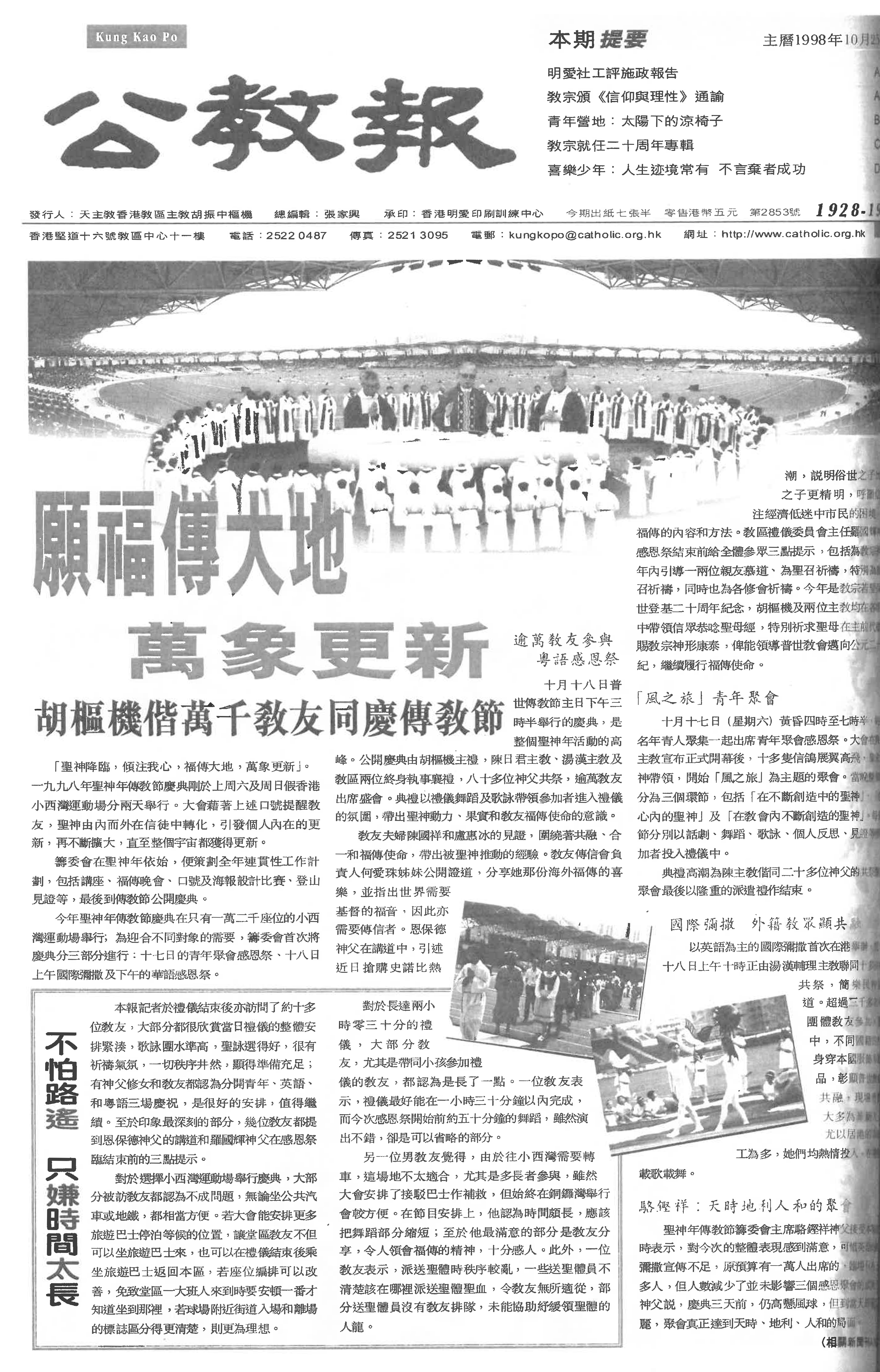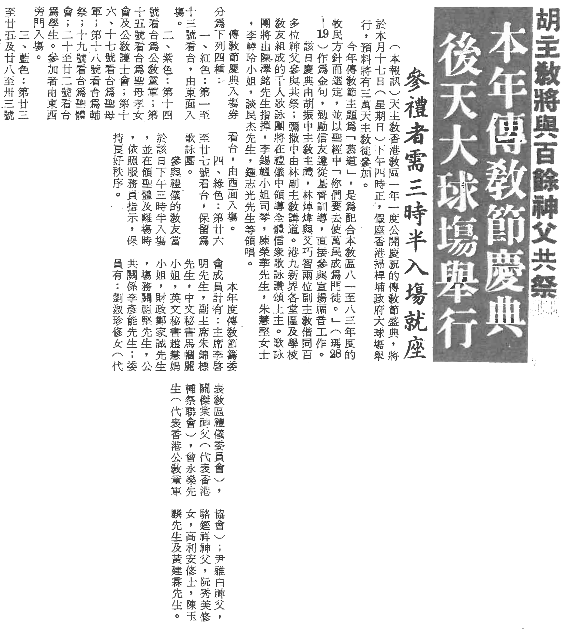 香港教區一年一度的傳教節公開慶典於1979年10月21日主日下午三時半假掃桿埔政府大球場隆重舉行。胡振中主教偕同近百位神父共祭,港九新界各堂區約三萬名教友出席,參加情況熱烈。