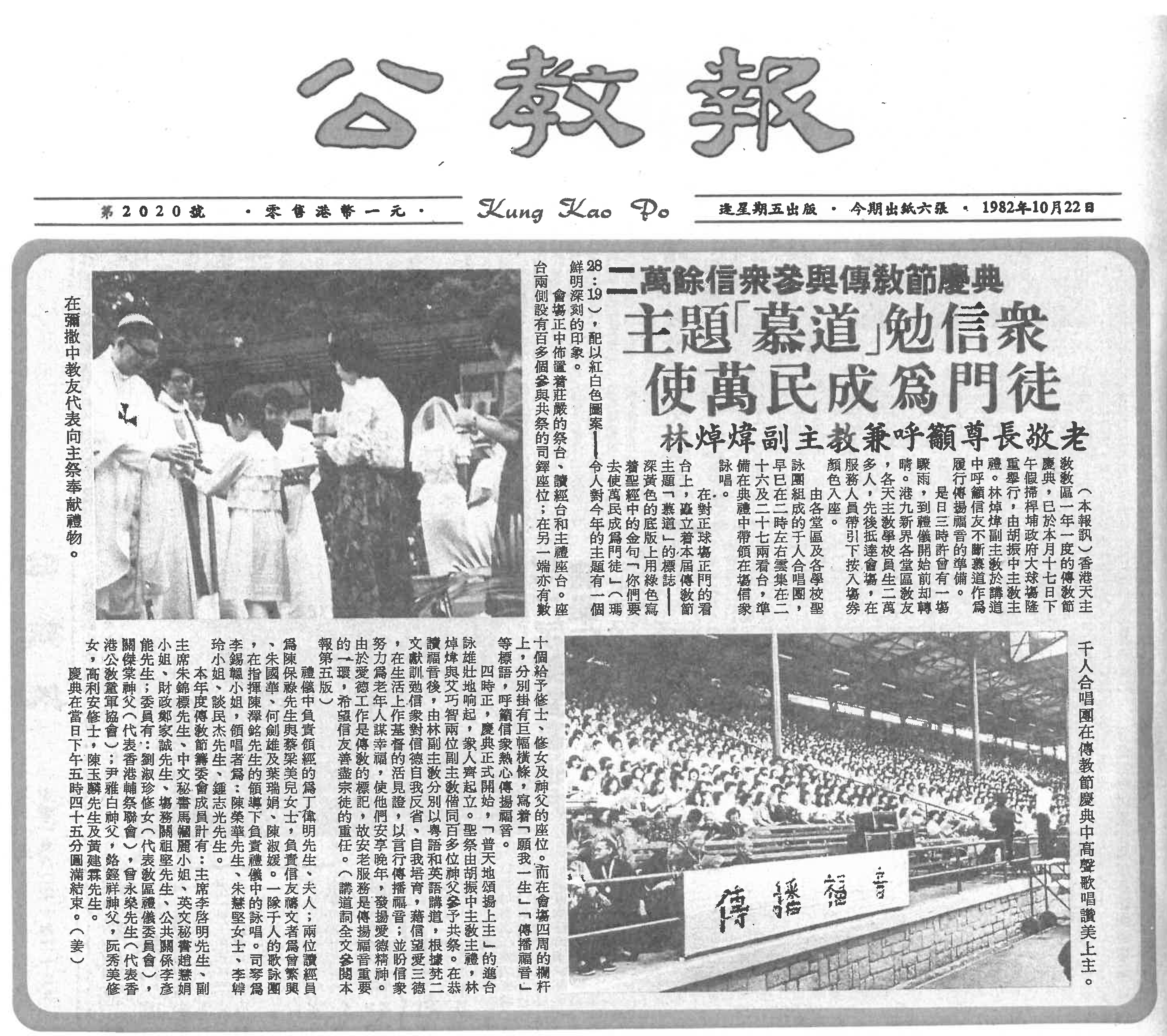 香港教區一年一度公開慶祝的傳教節,在1978年10月22日在政府大球場舉行,有二萬多名教友參加。當日亦為教宗若望保祿二世在羅馬就職日子,全體教友在胡振中主教領導之下,特別為新教宗祈禱,更多謝天主賜給全球天主子民一位充滿信德和自我犧牲精神的最高領袖。當日慶典的主題為「共融的教會」,並選定了「以主為基、傳揚真理」八字作為參與者的座右銘。