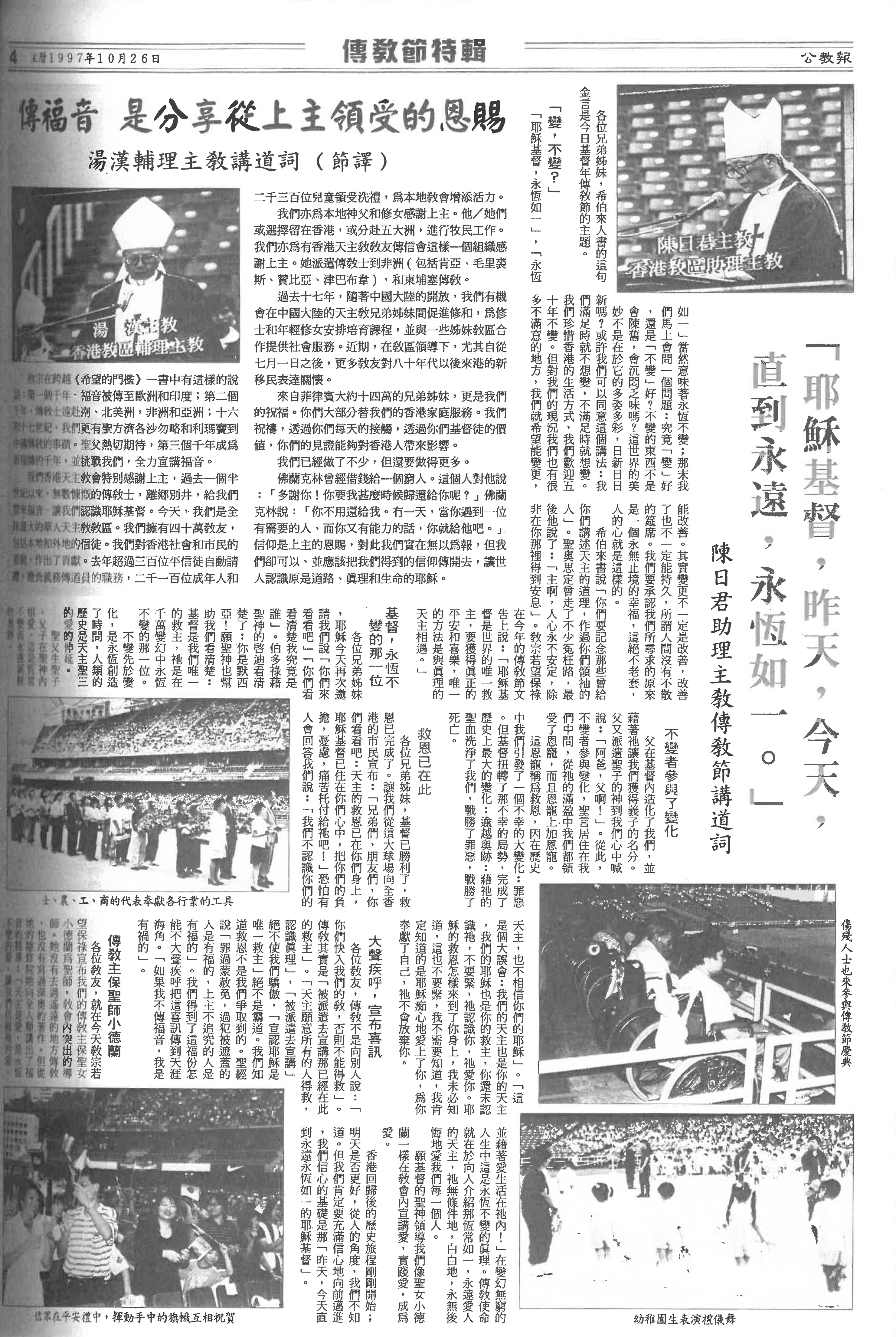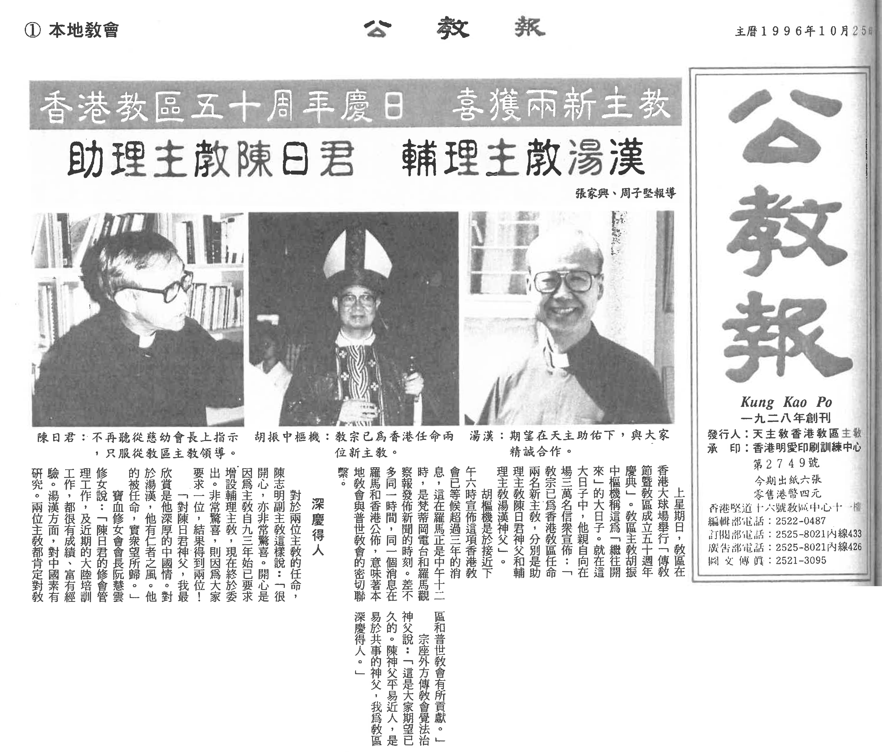 1996年10月20日,教區在香港大球場舉行傳教節暨教區成立五十週年慶典教區主教胡振中樞機稱這為「繼往開來的大日子。就在這大日子中,他親自向在場三萬名信眾宣佈教宗已為香港教區任命2名新主教,分別是助理主教陳日君神父和輔理主教湯漢神父。