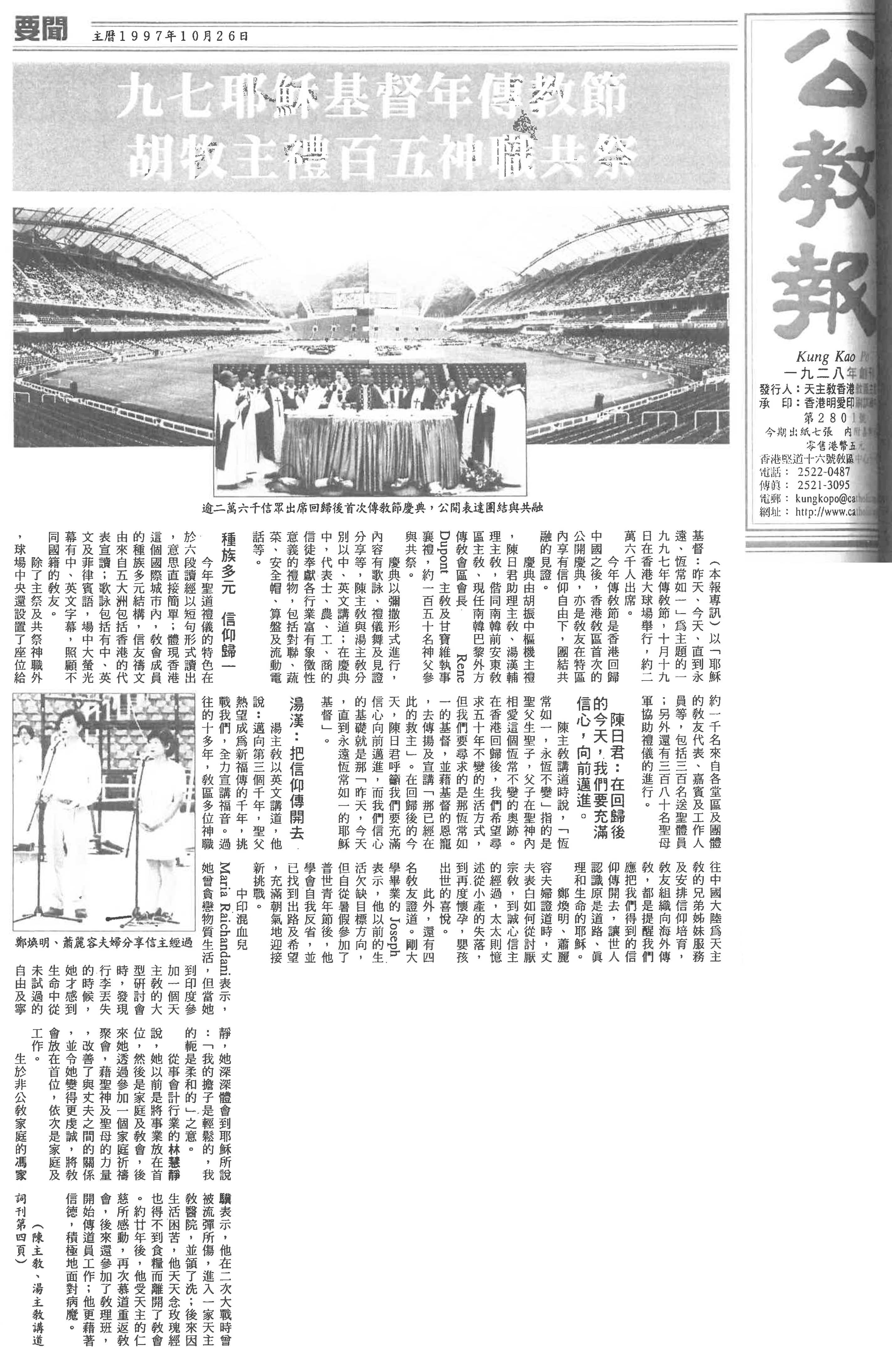 1997年傳教節10月19日在香港大球場舉行,約二萬六千人出席,是香港回歸中國之後,香港教區首次的公開慶典,亦是教友在特區內享有信仰自由下,團結共融的見證 今年的聖道禮儀的特色在於六年讀經以短句形式讀出,意思直接簡單:體現香港這個國際城市內教會成員的種族多元結構,信友禱文有來自五大洲包括香港的代表宣讀, 歌詠包括有中英文及菲律賓語 。場中大螢幕有中英文字幕,照顧不同國籍的教友。除了主教及共祭神父外,球場中央還設置了座位及約一千名來自各堂區及團體的教友代表、嘉賓及工作人員等。