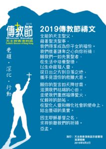 教宗方濟各欽定2019年10月為「傳教月」,呼籲我們關注傳教。今年的「教區傳教節慶典專責小組」深知「傳教」並非只靠「活動」;若要教友的服務和傳教精神有基礎,這熱忱必須從內裡的信念衍生出來,在生活中做見證。